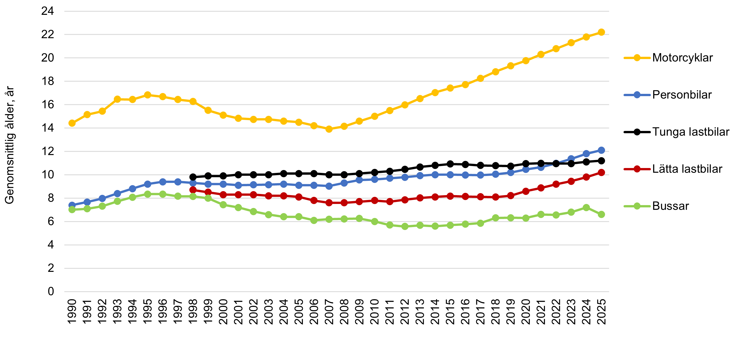 Figur. Genomsnittlig ålder i år på fordon i trafik, för olika fordonsslag. Åren 1990–2025.